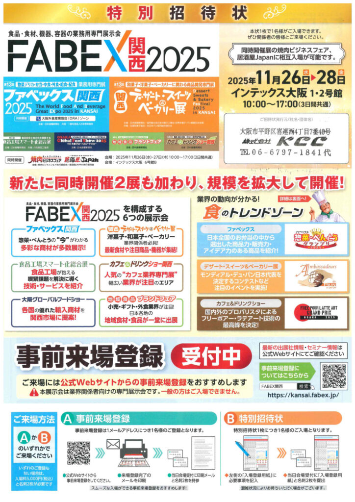 2025年11月26日(水)~28日(金) インテックス大阪1・2号館にて開催されます。 「第13回ファベックス関西2025」 大阪外食産業協会(ORA)ゾーンに出展いたします。 2025年11月04日 2025年11月26日(水)~28日(金) インテックス大阪1・2号館にて開催されます。 「第13回ファベックス関西2025」 大阪外食産業協会(ORA)ゾーンに出展いたします。 詳しくはこちら ↑クリックで拡大 記事一覧に戻る