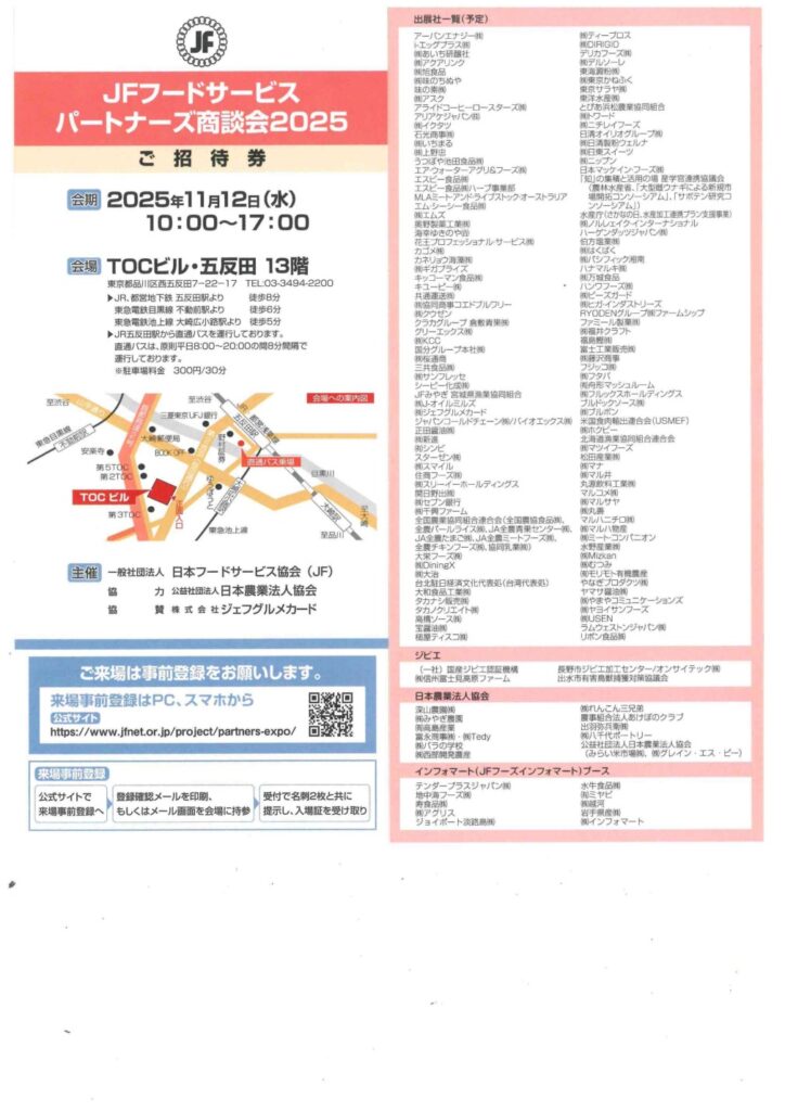 「JFフードサービスバイヤーズ商談会2025」に 出展致します。 2025年10月10日 2025年11月12日(水)TOCビル・五反田で開催されます 「JFフードサービスバイヤーズ商談会2025」に出展致します。 ※ご来場の際はご招待券QRコードより事前予約の程、よろしくお願い申し上げます 記事一覧に戻る