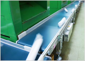 KCCでは14槽(※本社工場の場合)の洗濯工程により優れた洗浄品質を確保しています。4回の予洗い、80度の高温水による本洗いや、塩素漂白・消毒、そしてすすぎを十分に行い、清潔な状態で包装して出荷されます。